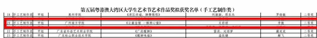 近日,第五届粤港澳大湾区大学生艺术节拟获奖名单公布。经省教育厅组织专家评审,广州南方学院的两大类型作品共11项作品脱颖而出。其中设计学院的获奖作品中,获得一等奖1项、二等奖2项、三等奖2项。