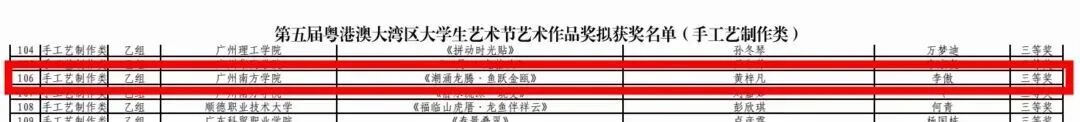 由李傲担任指导教师,黄梓凡创作的作品《潮涌龙腾·鱼跃金瓯》获艺术作品奖(手工艺制作类)三等奖。
