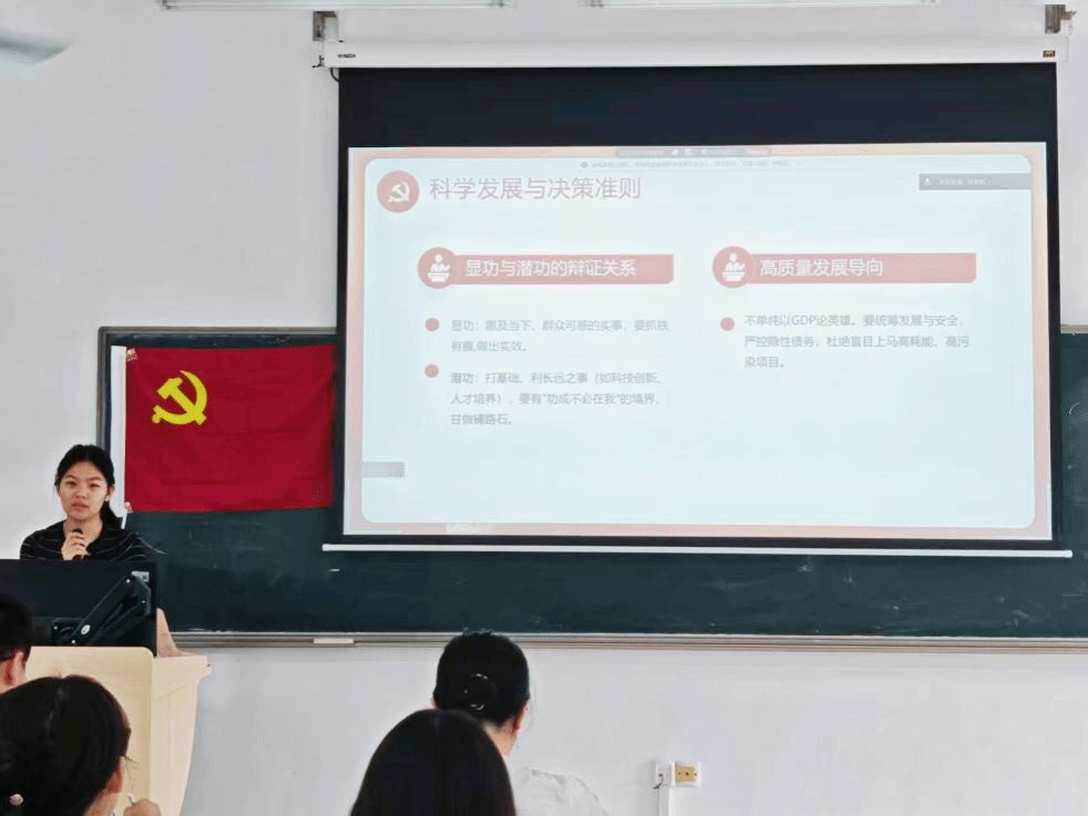之后,会议进入第二项议程。蒋慧新同志对树立和践行正确的政绩观进行了系统解读,围绕五大核心板块明确了学习重点:树立正确政绩观是高质量发展、强国复兴的必然要求;紧扣核心问题,坚持以人民为中心;辩证处理显功与潜功,统筹发展与安全;力戒形式主义,实干担当;全体党员锤炼党性,学生锤炼本领,融入国家发展。